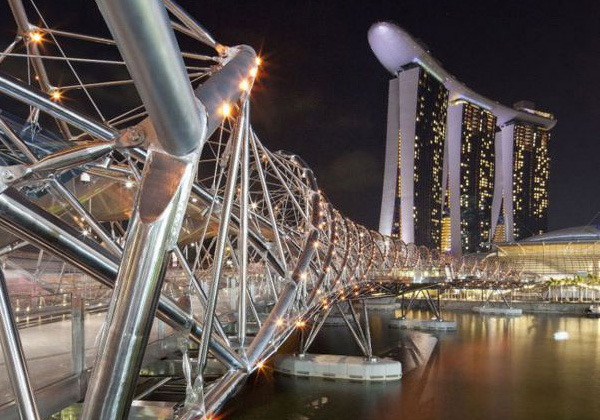 橫跨濱海灣、銜接新加坡新市區(qū)與中心商業(yè)區(qū),雙螺旋橋是Cox Architects和Architecture 61建筑事務(wù)所的一個聯(lián)合項目。它上面設(shè)有四個懸臂式觀景平臺 ,不銹鋼鋼管呈兩條優(yōu)雅的螺旋曲線相互纏繞,讓人行橋如同蛟龍一般盤江而臥,不過獨特的外觀其實是取意于DNA的螺旋結(jié)構(gòu),寓意著生命、延續(xù)、更新和成長。當(dāng)夜晚有LED燈亮起時,在玻璃與不銹鋼管的折射下 ,整座橋會綻放出絢爛的美麗。
